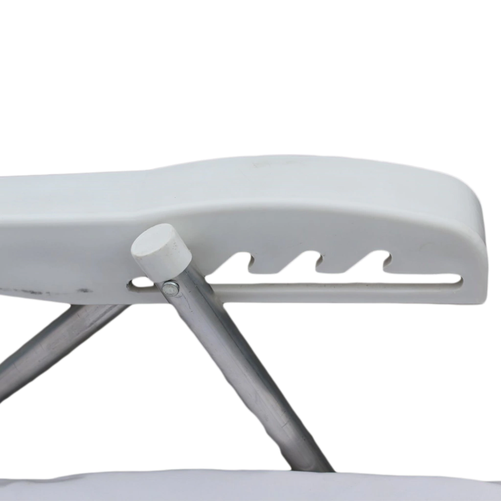 Possui um design dobrável, ideal para transporte e uso em diferentes ambientes. Seu encosto é reclinável e possui cinco posições, inclusive Trendelenburg, uma posição corporal em que o paciente é colocado em decúbito dorsal, com os pés mais elevados que a cabeça, podendo ser ajustado para posições de atendimento ou descanso. Os apoios de braço são feitos de material plástico branco, proporcionando suporte adicional. A cadeira suporta até 100 kg.